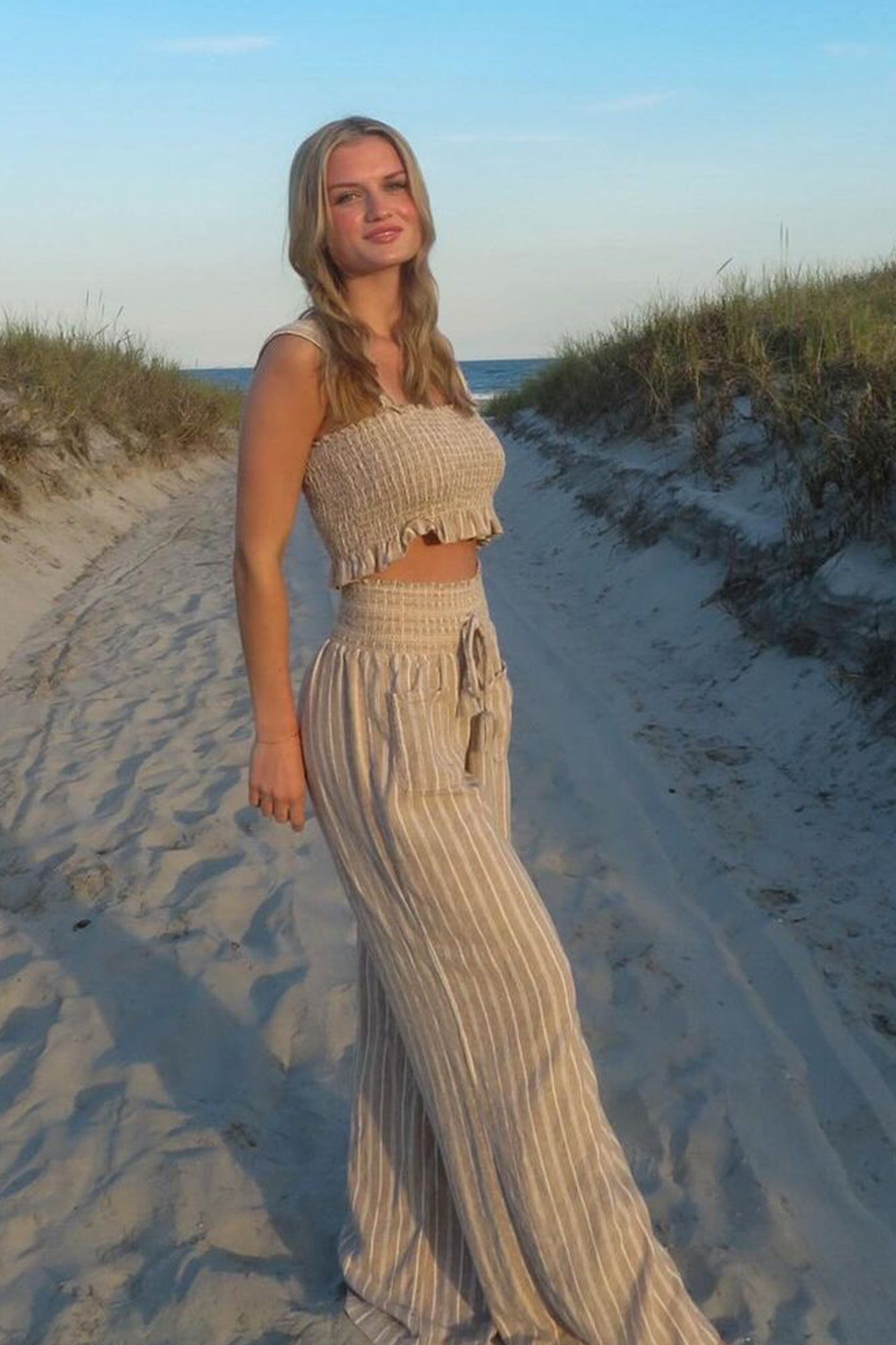 Elevate your wardrobe with the Smocked Top and Boardwalk Pant Linen Set - Khaki. This effortlessly chic outfit combines comfort and style, ideal for those sunny days out or casual get-togethers. Made with a breathable fabric blend, you'll feel as great as you look.