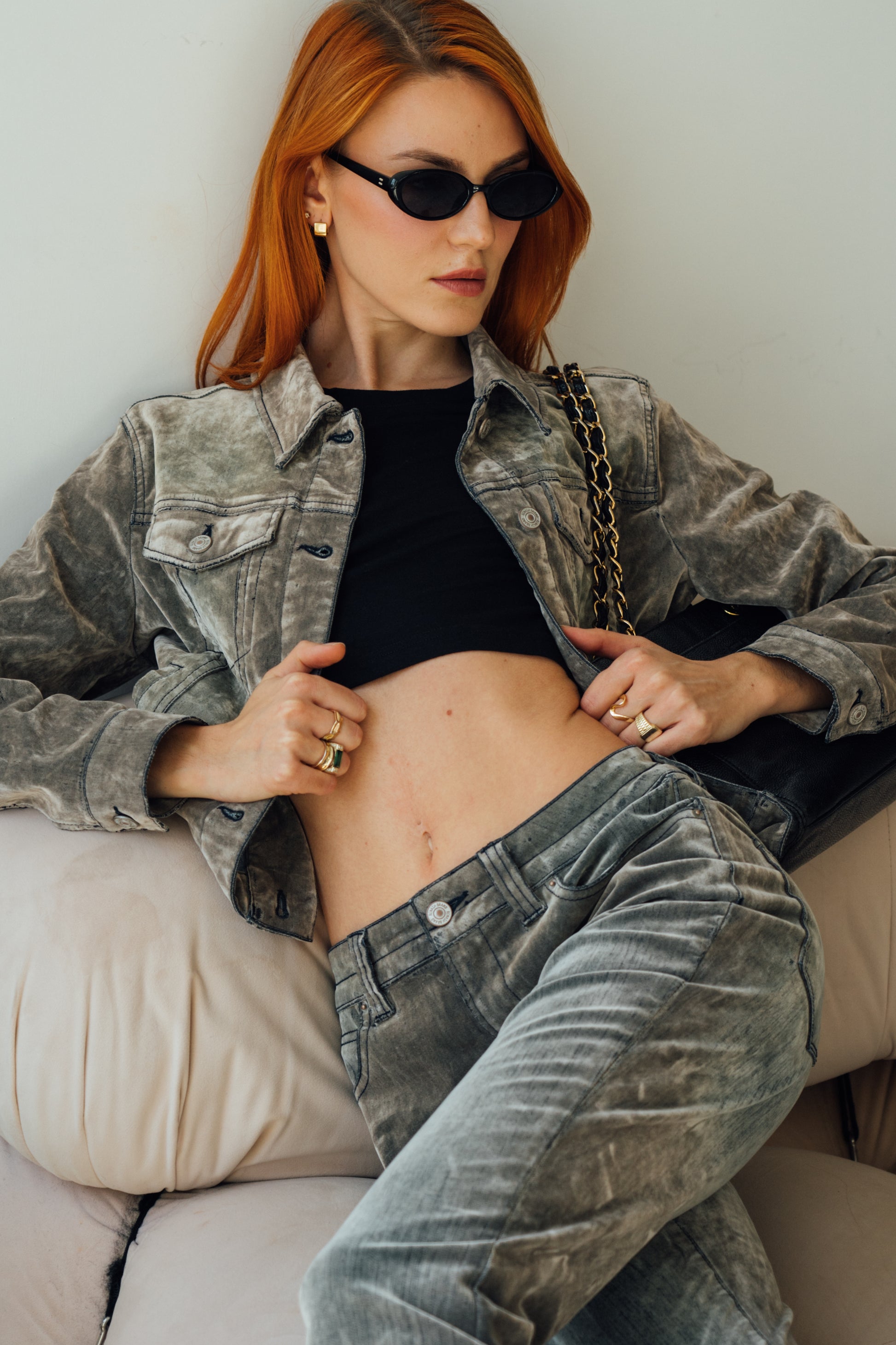 Introducing the Flocked Trucker Jacket in Light Grey/Black, a perfect blend of style and comfort. This jacket is crafted from a premium fabric mix that not only looks good but feels great. Whether you're heading out for a casual day or a night out, this trucker jacket is your go-to outerwear.